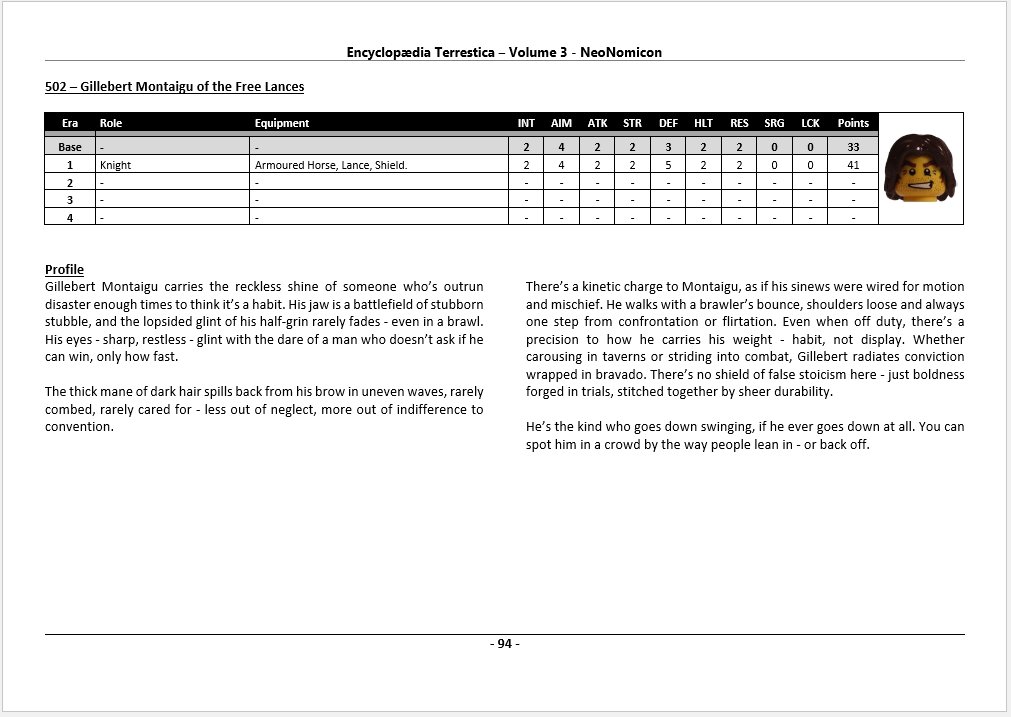 The NeoNomicon is your complete character compendium for the universe of TERRESTE; over a hundred aristocrats and commoners brought to life across four Ages, each with full biographies and in-game stats.